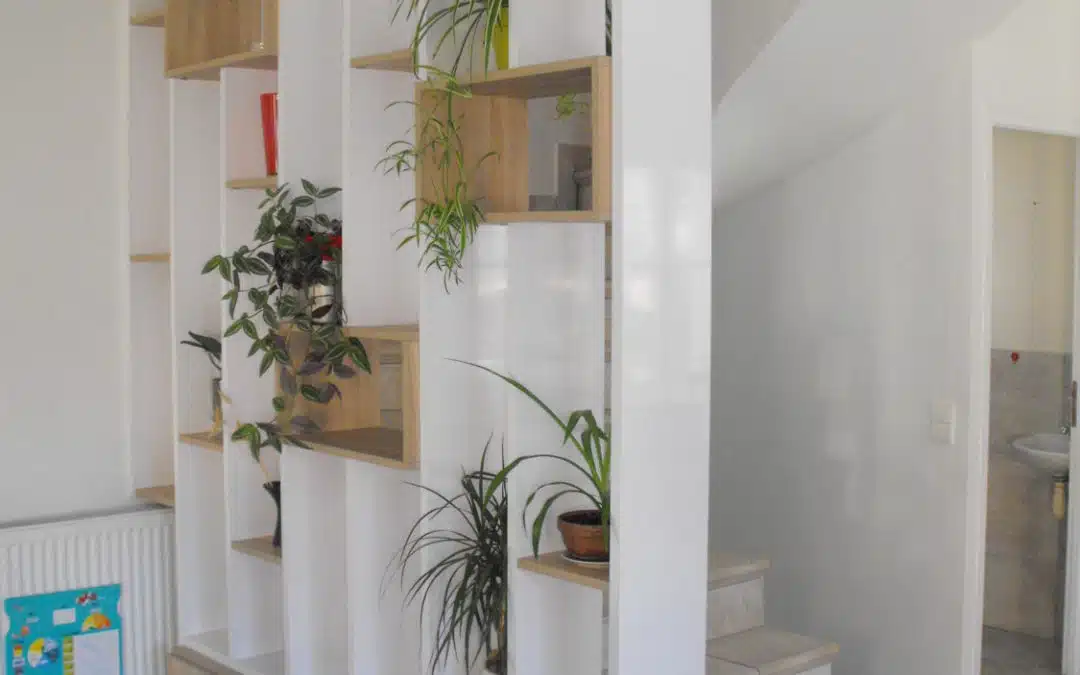 Réalisation d’un meuble claustra derrière un escalier. Il est réalisé en médium de 28 mm plaqué en stratifié blanc brillant. Les étagères et les niches sont en chêne mélamine 19mm.